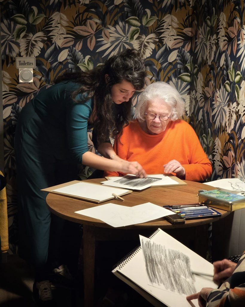 Ses ateliers artistiques mêlent dessin de modèle vivant, écriture intuitive, lectures, et exploration dans un climat d’écoute et de liberté.